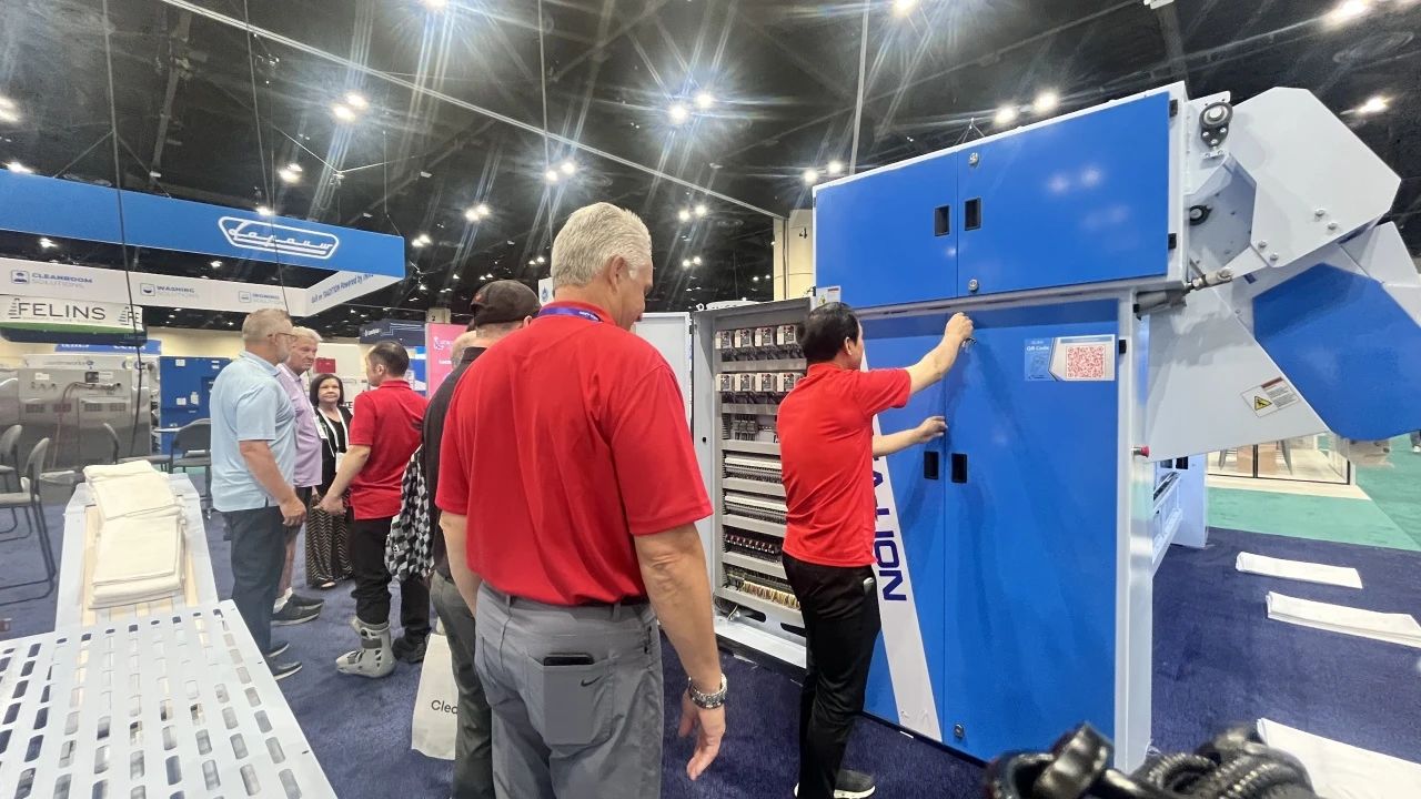 “Titanium”鈦系列洗脫機(jī)與烘干機(jī),聚焦高效洗滌與節(jié)能降耗雙重優(yōu)勢(shì)。通過精準(zhǔn)控溫、智能水循環(huán)系統(tǒng)及變頻電機(jī)技術(shù),實(shí)現(xiàn)單位時(shí)間內(nèi)更高洗滌量和烘干量的同時(shí),大幅降低水、電、蒸汽消耗,為用戶帶來經(jīng)濟(jì)與環(huán)保兼具的卓越體驗(yàn) 參展人士對(duì)這一系列設(shè)備表現(xiàn)出了濃厚興趣,在現(xiàn)場(chǎng)海獅人員的詳細(xì)操作講解下,他們對(duì)中國制造的研發(fā)制造實(shí)力有了更深刻的認(rèn)識(shí),紛紛為海獅機(jī)械的創(chuàng)新能力點(diǎn)贊。