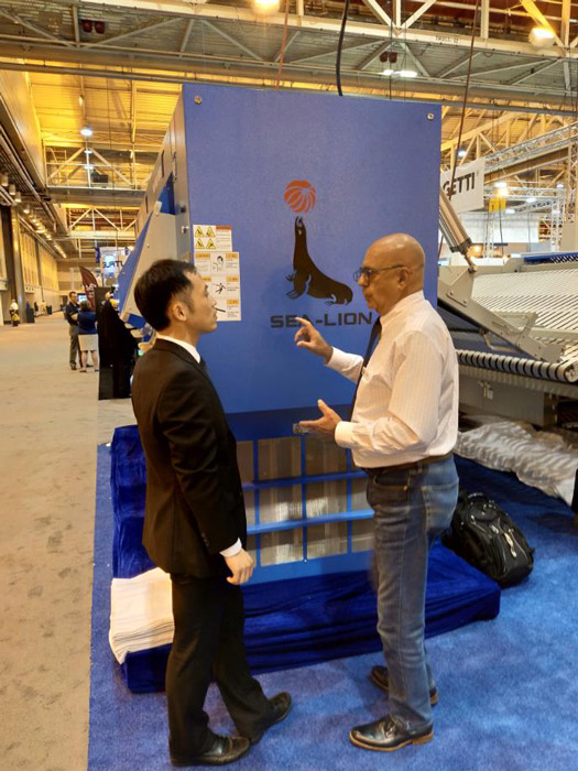 At that day ,Jiangsu Sea-lion Machinery Co.,Ltd general manager Wu shixin and executive deputy general manager Zhang jianfeng led the team ,showed XGQ-100CFQ automatic washer extractor、ZD3300-VB high speed flatwork folder、ZBQ3300III three station feeder .